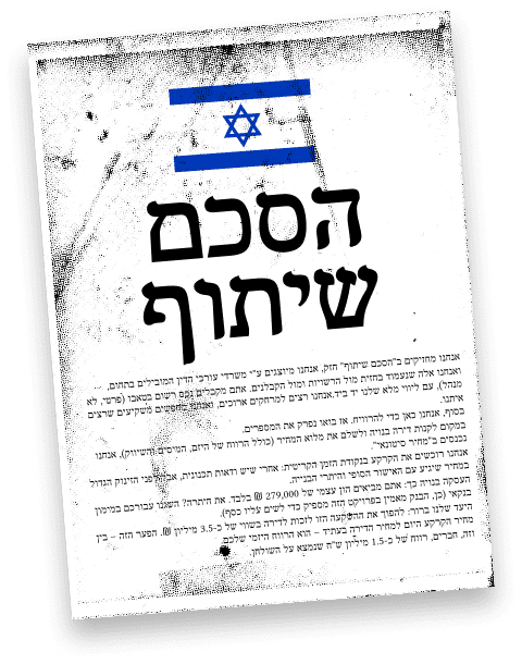 אנחנו מחזיקים ב"הסכם שיתוף" חזק, אנחנו מיוצגים ע"י משרדי עורכי הדין המובילים בתחום, ואנחנו אלה שנעמוד בחזית מול הרשויות ומול הקבלנים.